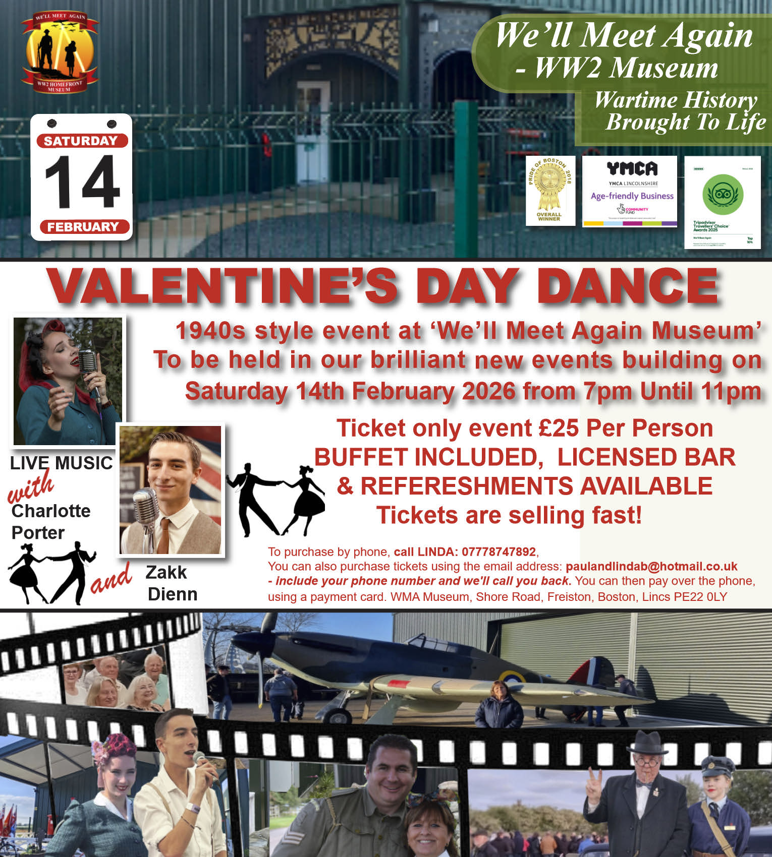 Normal Opening Times: The Museum is open 10:00-16:00, Friday, Saturday and Sunday. The Museum will be open until 4pm on Sunday the 7th December 2025 - It will re-open at 10am on Friday 30th January 2026. Admission Prices: Adults £8 ~ Children under 16yrs £6 ~ Children under 5yrs - free ~ Family admission (2 Adults & 2 Children) £24. Dogs on leads are welcome on the museum grounds, but only Guide dogs and Assistance dogs are permitted in the exhibition halls, and the Ration Book Cafe. If you have come to visit with your dog, you can walk it around the rear display area of the museum and sit with it on the decking beside the Cafe or in front of the Military Room, but regrettably, we don't allow dogs in any of the exhibition rooms or have any indoor areas where they can stay during your visit. Thanks for your understanding.