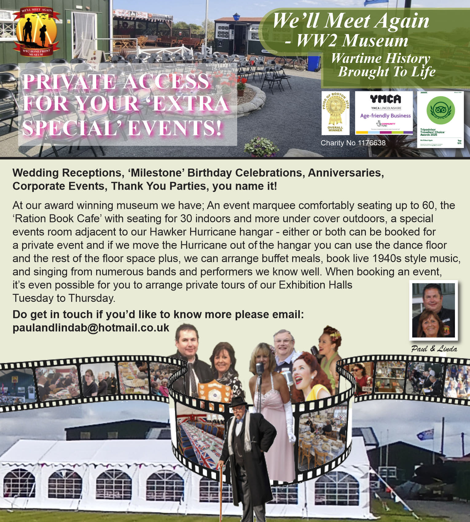 Normal Opening Times: The Museum is open 10:00-16:00, Friday, Saturday and Sunday. The Museum will be open until 4pm on Sunday the 7th December 2025 - It will re-open at 10am on Friday 30th January 2026. Admission Prices: Adults £7 ~ Children under 16yrs £5 ~ Children under 4yrs free ~ Family admission (2 Adults & 2 Children) £19. Dogs on leads are welcome on the museum grounds, but only Guide dogs and Assistance dogs are permitted in the exhibition halls, and the Ration Book Cafe. If you have come to visit with your dog, you can walk it around the rear display area of the museum and sit with it on the decking beside the Cafe or in front of the Military Room, but regrettably, we don't have any indoor areas where they can stay during your visit. Thanks for your understanding.