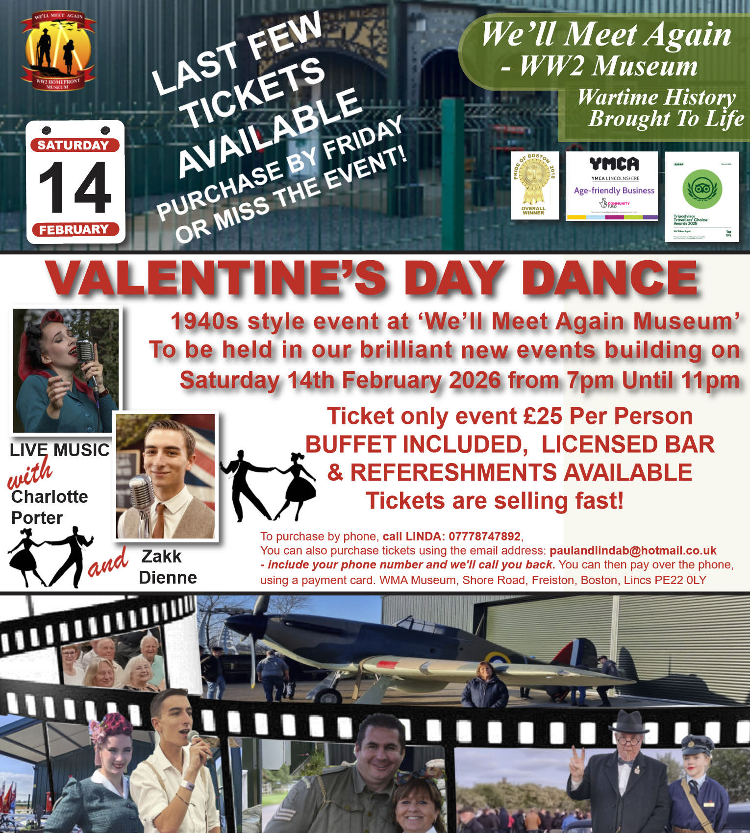 Normal Opening Times: The Museum is open 10:00-16:00, Friday, Saturday and Sunday. The Museum will be open until 4pm on Sunday the 7th December 2025 - It will re-open at 10am on Friday 30th January 2026. Admission Prices: Adults £8 ~ Children under 16yrs £6 ~ Children under 5yrs - free ~ Family admission (2 Adults & 2 Children) £24. Dogs on leads are welcome on the museum grounds, but only Guide dogs and Assistance dogs are permitted in the exhibition halls, and the Ration Book Cafe. If you have come to visit with your dog, you can walk it around the rear display area of the museum and sit with it on the decking beside the Cafe or in front of the Military Room, but regrettably, we don't allow dogs in any of the exhibition rooms or have any indoor areas where they can stay during your visit. Thanks for your understanding.