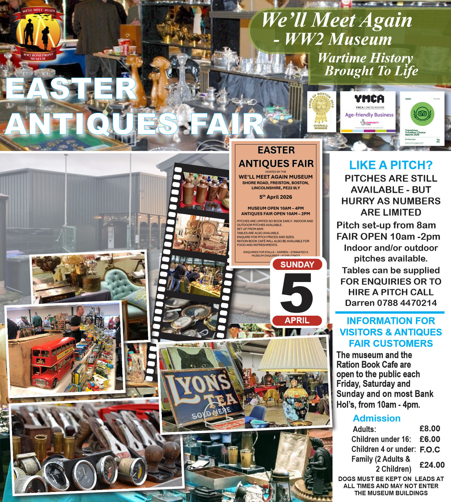 Normal Opening Times: The Museum is open 10:00-16:00, Friday, Saturday and Sunday. Admission Prices: Adults £8 ~ Children under 16yrs £6 ~ Children under 5yrs - free ~ Family admission (2 Adults & 2 Children) £24. Dogs on leads are welcome on the museum grounds, but only Guide dogs and Assistance dogs are permitted in the exhibition halls, and the Ration Book Cafe. If you have come to visit with your dog, you can walk it around the rear display area of the museum and sit with it on the decking beside the Cafe or in front of the Military Room, but regrettably, we don't allow dogs in any of the exhibition rooms or have any indoor areas where they can stay during your visit. Thanks for your understanding.